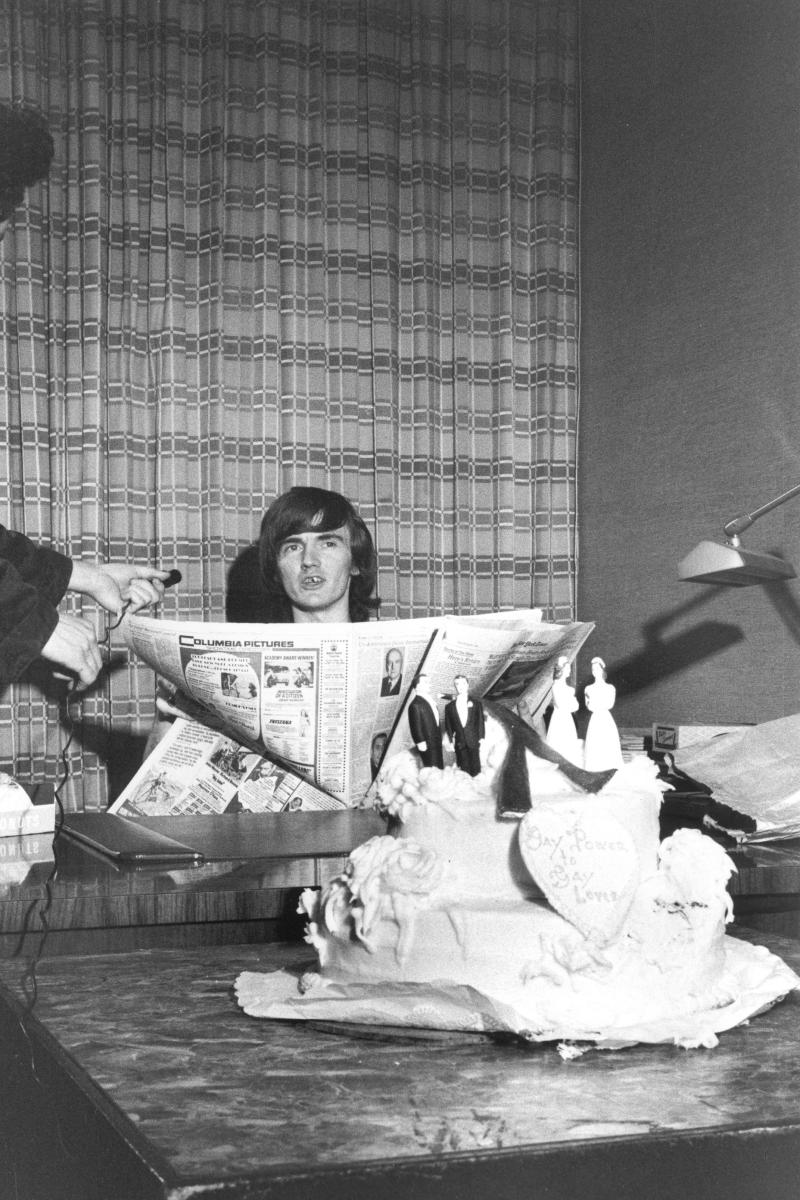 GAA president Jim Owles seated at the City Clerk’s desk, with a wedding cake, at the Marriage Bureau Zap on June 4, 1971