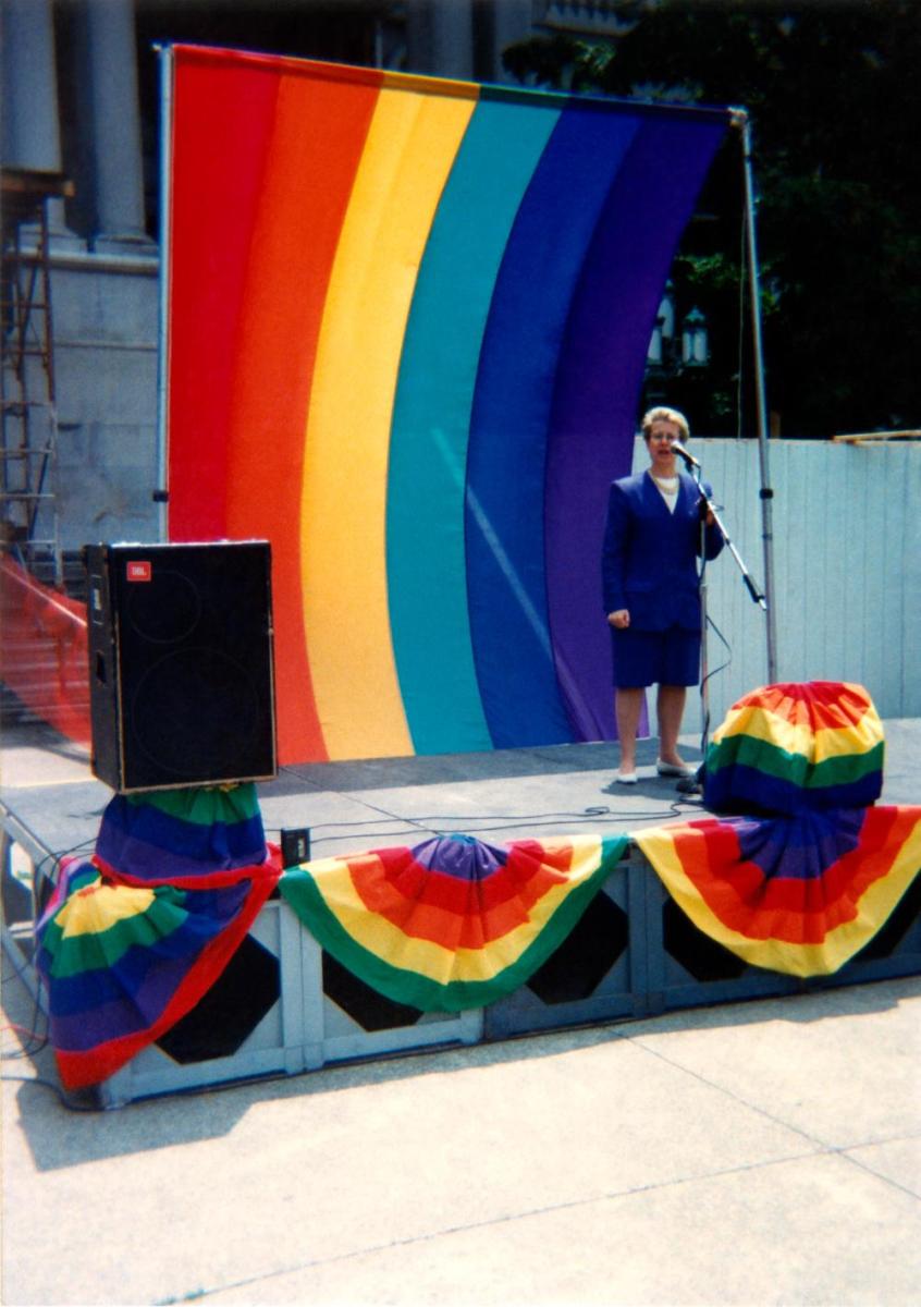 Deborah Glick speaking at the New York State Capitol for the 25th Anniversary of Stonewall, June 1994. NYSM H-2024.45