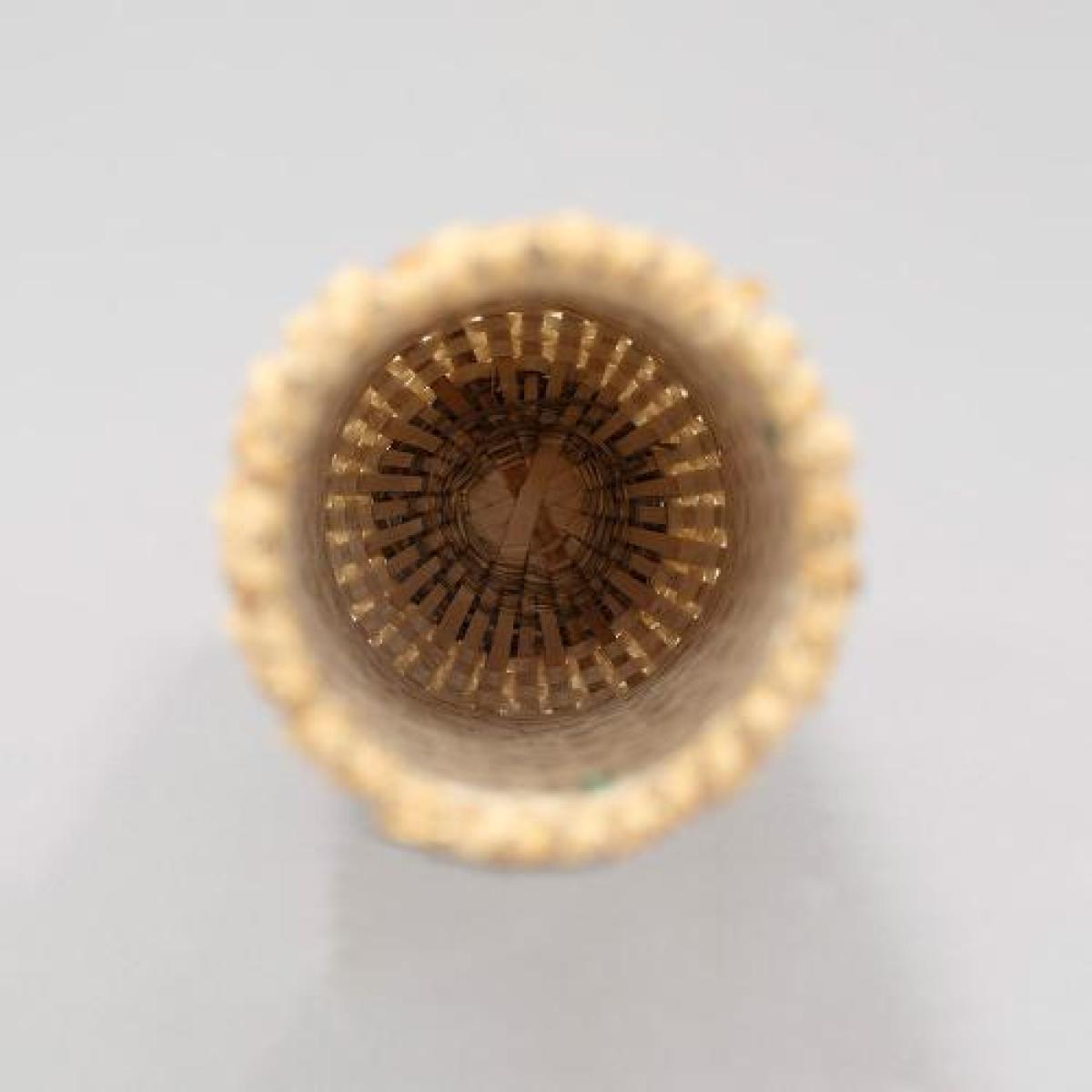 “My Tsi:tsi Revisited” is an extraordinary double weave basket by Carrie Hill (Kanien’keha:ka, Akwesasne) that addresses the devastating impact of the invasive wood-boring beetle Emerald Ash Borer (EAB) on Haudenosaunee and Indigenous basketry. The beetle burrows into the Black Ash trees and the larvae feed on the inner layers of the bark leaving holes and weakening the splints. The beetle activity ruins the shiny and smooth qualities for which ash splint baskets are appreciated. Eventually, the EAB kills the tree, the preferred source for Haudenosaunee basketmakers. For Carrie Hill, “creating baskets from Black Ash has been something that goes back in my family for generations and is now being affected by this beetle.”
