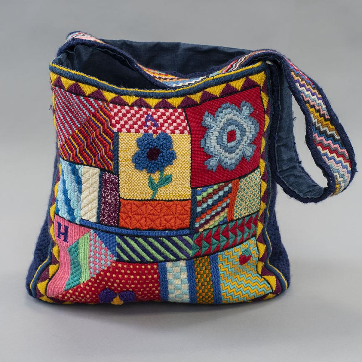 One side of this bag includes symbols that tell the story of Alonso’s life: a lighthouse for Long Island, a Jewish star for herself, a Puerto Rican flag for her husband, a rag doll for their son, the Golden Gate bridge to represent the year they lived in San Francisco, the skyline of New York City for their long-time home, a feminist symbol for her activism, a reference to her work as an ESL teacher, and a needle and thread for her love of embroidery. That love is also represented in the “sampler” of stitches on the back, and the multi-colored Byzantine stitch on the strap.