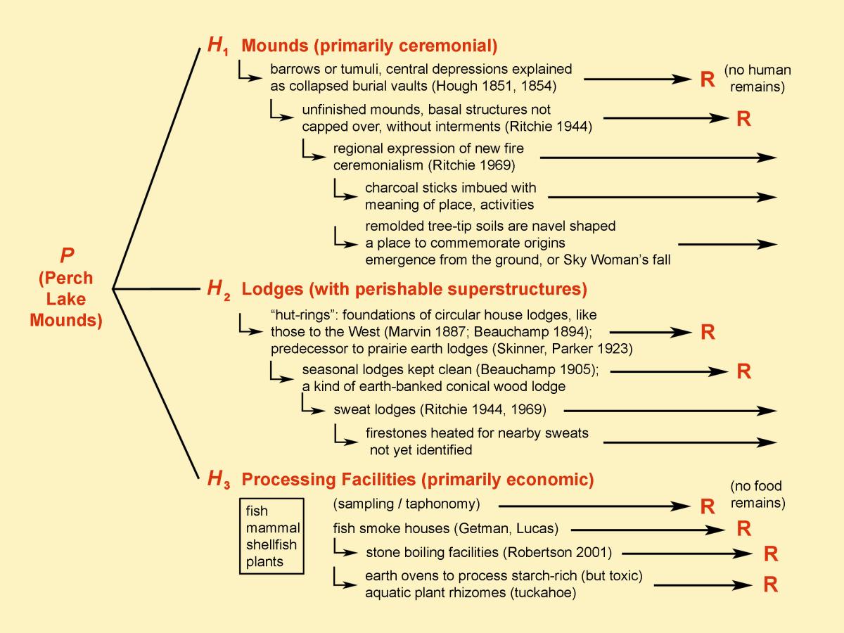Over the years numerous explanations for the mounds have been offered by archaeologists. The accompanying diagram organizes these diverse interpretive strains using a schema that helps to illustrate how the Method of Multiple Alternative Hypotheses can be used in a reiterative way to work towards better explanation. P on the left is the overarching phenomenon of the Perch Lake mounds; on the right, proposed explanations are placed into three broad but not necessarily exclusive categories. R signals rejection of the hypothesis on the basis of archaeological evidence.