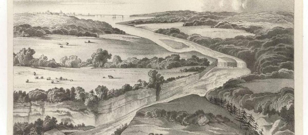 Birdseye view of Niagara Falls and the surrounding country. From James Hall, 1843, The Geology of New York, Part 4, Comprising the Geology of the Fourth District. New York State Geological Survey.